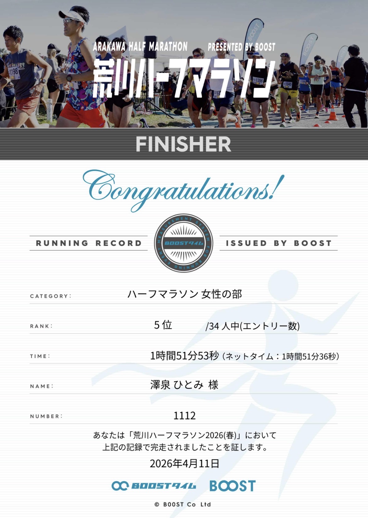 本日、フルマラソン2週間前という事で荒川ハーフマラソンに参加してきました(´∀`)天気も良くマラソン日和でした🏃♀️そして荒川なので私の苦手な周回コースではありますが、今回もハーフのPB更新出来ました♪♪結果としては1:47:02。前回より3分ほど早く走れました😆✨ただミキティさんはここから3分以上早いのかと思うとやっぱり妖怪(めちゃくちゃ褒め言葉✨)なのだと確信しました!!本当凄いなと思います🥹もっと早く走れるように頑張ります😊