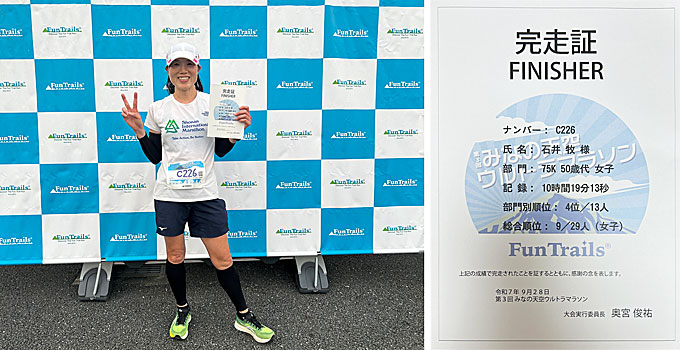 秩父でのウルトラマラソン75キロを走りました。苦手な登り坂の克服と思っていましたが、結局は登りは歩いてばかりでますます苦手なまま終わりました。今年4月の富士五湖のウルトラ100キロ、コースロストしてちゃんと走れなかった事を悔やんでいて12月の沖縄ウルトラ100キロを走ります。その為の練習でした。小島さんを見習って100キロ完走したいです。