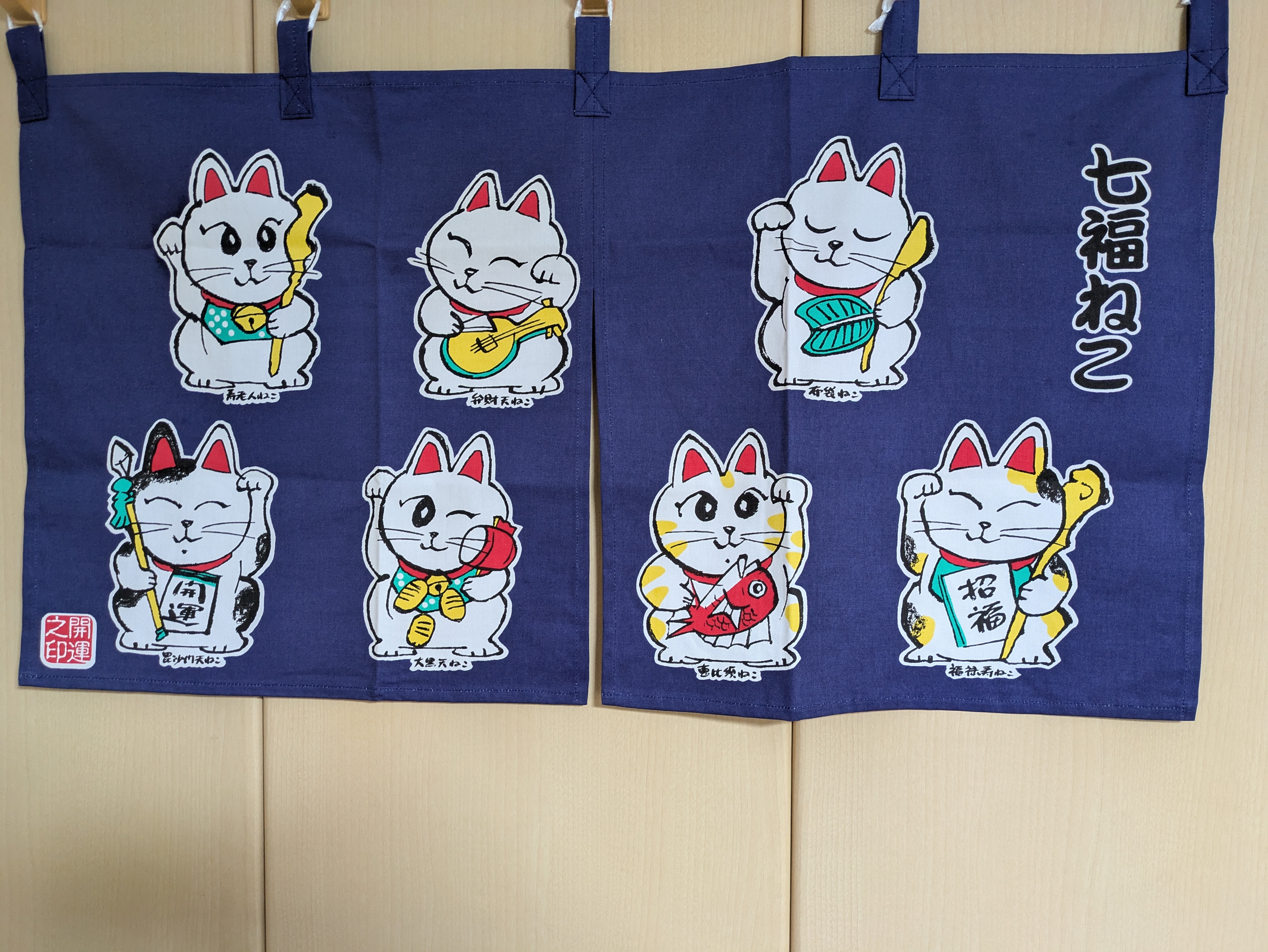 往きに途中下車して、30年ぶりに中尊寺に行って来ました。本堂前のみやげ屋で、七福猫ののれんを見つけ買って来ました。それぞれの猫の表情がおもしろいですね。ちなみに私は猫を2匹、飼っています。