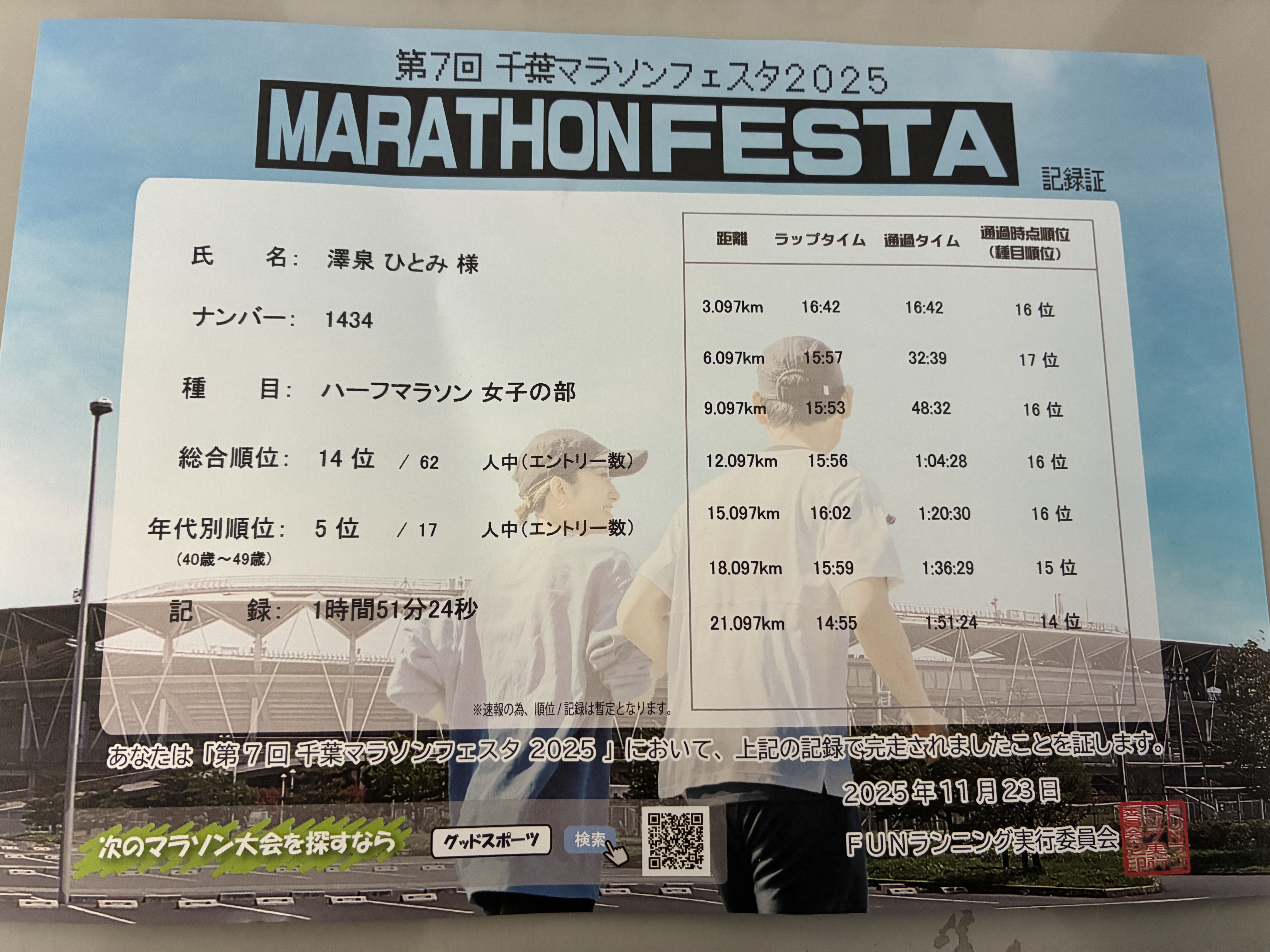 湘南国際の2週間前!!という事でハーフを走って来ました。今回は千葉マラソンフェスタというフクダ電子アリーナの周回コースです。周回コースはあまり好きでは無いですがこのコースは結構走り安かったです(´∀`)結果は1:51:24何気にハーフのベストタイムかもしれません✨普段ハーフは2時間切れば良いかぐらいにしか思ってなかったので、もっと早く走れるように頑張ります♪♪