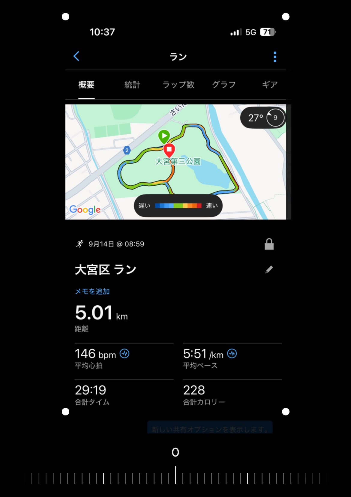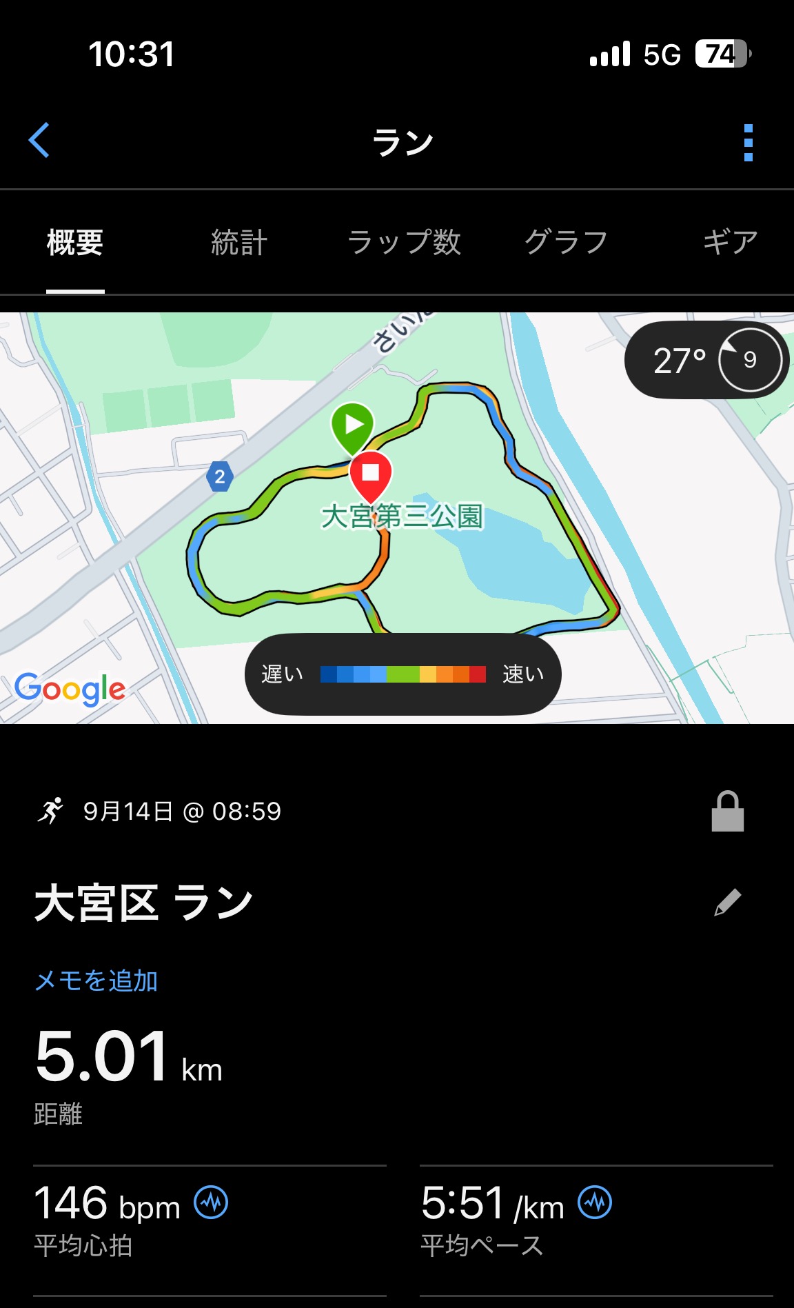 今年は8月9月に身体の検査が多く大体週1〜2回の朝ジョグのみ荒川河川敷です。