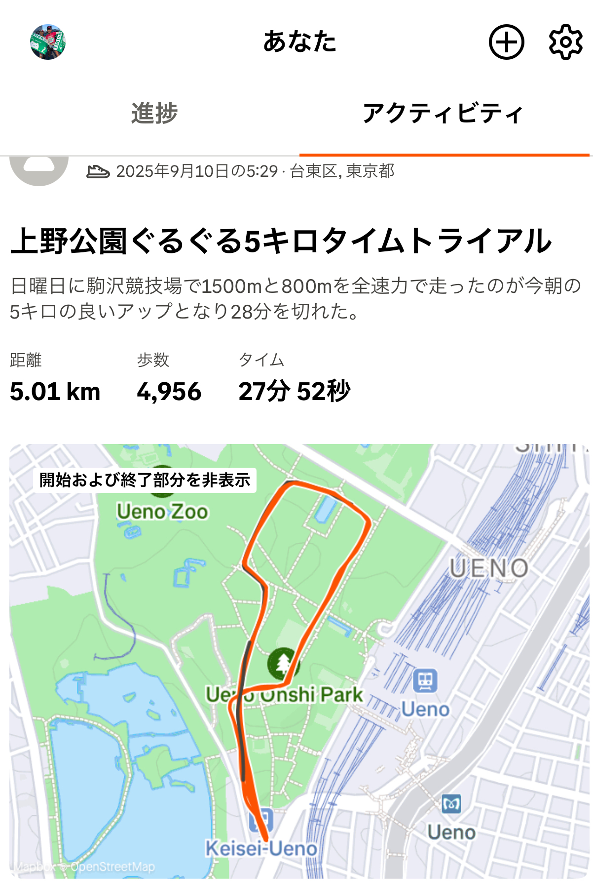 7日(日)に駒沢競技場で1500mと800mを全速力で走ったのが良いアップとなり1人でも28分が切れました。いつもは29分代。