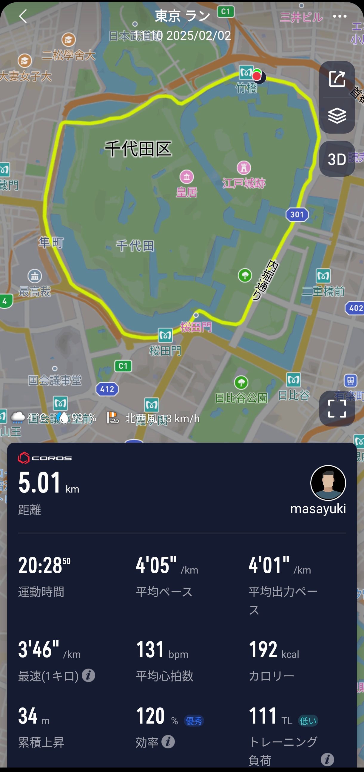 1月皇居TimeTrial6位に甘んじ、2025MVP争奪の月間ポイ活に早々と失敗。この出遅れの挽回を図るべく2月リモート参戦を決め、無風低温の絶好条件下で序盤・中盤・終盤と気合いで爆走するも、結果はアレレ…。3日後の内濠駅伝に備え、おとなしく完全休養します。