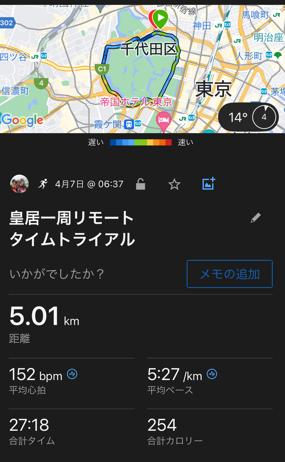 仕事終わりに皇居外苑の1周800mコースで今年初めてのTT