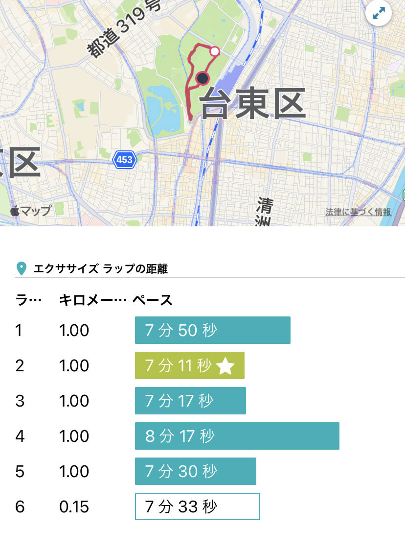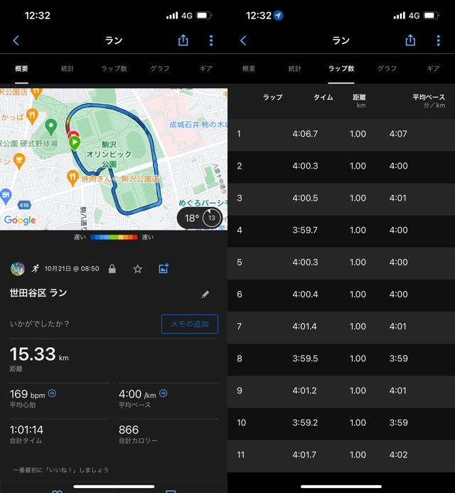 来週の「フードバレーとかちマラソン (ハーフ)」に向けて、駒沢公園にて4:00/kmの15kmペース走。冒頭5kmの記録を提出します。ちょっとずつスピード持久力が付いてきて、それに反比例でお腹のお肉が削がれてきました(笑)。