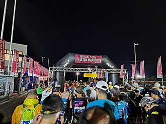 | 家から日帰りで行ける大会ということで走りました。コースは行方市を出発してかすみがうらに隣接する北浦を鹿島市まで南下して戻ってくるコースです。橋を渡るところだけアップダウンがあるくらいで景色も単調、修行みたいでした。20キロ毎のラップタイムがとれるのと、平坦コースなので記録狙いの方々が多いらしく、5時のスタートで40キロまでは快適に走れていたのですが、そこからは疲労困憊、心拍数も上がり、最後は足が痛くてたまらず、腹筋を使って進まなければならなかったようで、お腹が筋肉痛になってました。50キロでワカメおにぎり、90キロでバナナと牛乳、牛乳、あとは水とポカリを飲んでました。ボランティアの方の数が多く、ゴール後は塩ちゃんこ鍋や豚汁、コーヒーのサービス、大量のお菓子のお持ち帰り、エイドに置いて欲しかったと思うものをたくさん頂きました。とても苦しいレースでしたがゴールしたときの充実感はひとしおでした。びっくりしたのはスタート前のセレモニーでデビィ夫人がスペシャルゲストで現れたこと、モノマネ芸人かと思いました(笑) |
