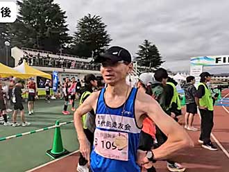 池田憲一≫前半ずっと緩く下り基調、後半ずっと緩く登り基調と少し難しいコースですが、私は初めてサブ3を意識したペースで挑戦しました。結果は予想通り30キロで失速、そこから苦しい走りとなり、41キロぐらいから意識もうろうとしてかなり歩いてしまい、ゴール後も少し動けないぐらい過去一のダメージがありました。軽い脱水症状だったのかも??まだまだサブ3は遠い先ですね。