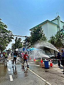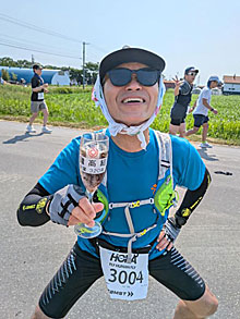 氷水を頭から何度も何度も被り(タライやバケツの水に氷がドサっと入っています)、エイドのたびに冷えたドリンク、スイカ、オレンジなど水分ばっかり大量に摂って胃も悪くなり、なかなか過酷な展開となってしまいました