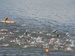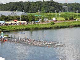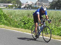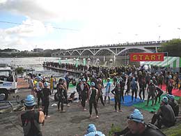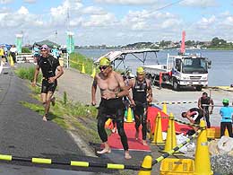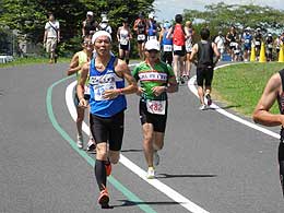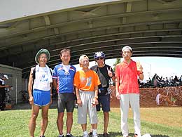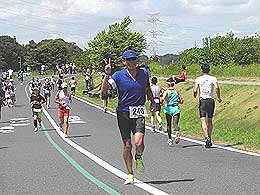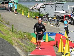 リレーの部は、昨年の久米→岡田→奥チームのタイムを目標に、今年はスイム久米→バイク岡田→ラン岩崎で挑戦。久米さんはコースをややロスし昨年のタイムをオーバーも元気に泳ぎ切り岡田さんへ。岡田さんは昨年より約2分半近くタイムを圧縮し戻ってきました。昨年奥ちゃんが10km40分16秒でしたがサムは43分30秒。しかし個人の部メンバーをごぼう抜き、最後の50mで160人目を抜いてゴール、ごぼう抜きのワールドレコードか? とにかくめちゃくちゃ暑かった。